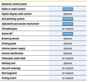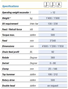 Attachable crawler track to 12 t excavator with the latest technology, high manoeuvrability (360° turn, 90° swivel and 600 mm shift) and very high torque. The drilling attachment is simply mounted to the excavator by means of a quick hitch and without tools. The control unit and the optional power supply are located in a package on the mount. The drill mast is radio remote controlled. The most important drilling parameters can be read on a digital display on the radio control. Optionally, a walking foot can be mounted for use on a walking excavator.